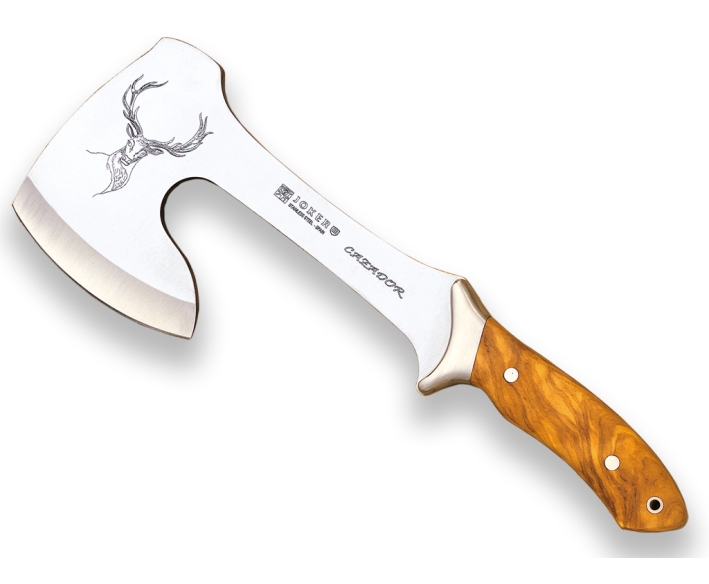 The Joker ax Cazador has been manufactured under the Denomination of Origin of Albacete (Spain). It is an ideal sports ax for cutting wood or cutting hunting trophies. The Joker hunting ax is full-blade and is made of 420 stainless steel, with a blade length of 33.5 cm, blade width of 11.5 cm and a thickness of 5 mm. The length of the handle is 13.5 cm and is made of olive wood.