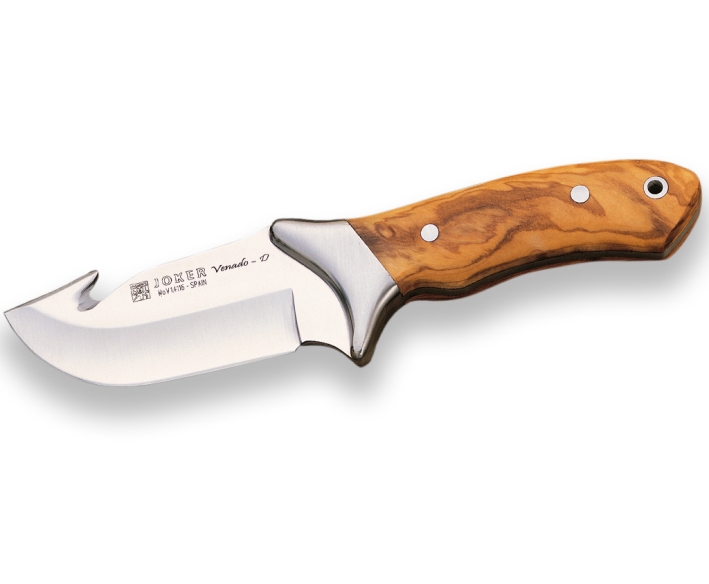 OLIVE WOOD HANDLE, GUT HOOK 10 CM STAINLESS STEEL FIXED BLADE JOKER VENADO SKINNER KNIFE. LEATHER SHEATH.