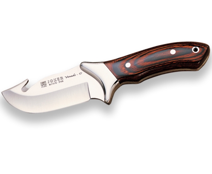 The Joker Venado Hunting Knife has been manufactured under the Denomination of Origin of Albacete (Spain). It is a hunting knife that due to its ergonomics, measurements and weight, as well as its cutting and skinning possibilities, make it a very complete tool for any hunter. The Joker Venado hunting knife is made of full tang blade made of Mova 1.4116 stainless steel with a blade length of 10 cm, blade width of 3 cm and a thickness of 4 mm. The length of the handle is 11.5 cm and it is made of stag horn. The Joker Venado knife is accompanied by a premium leather sheath in brown.