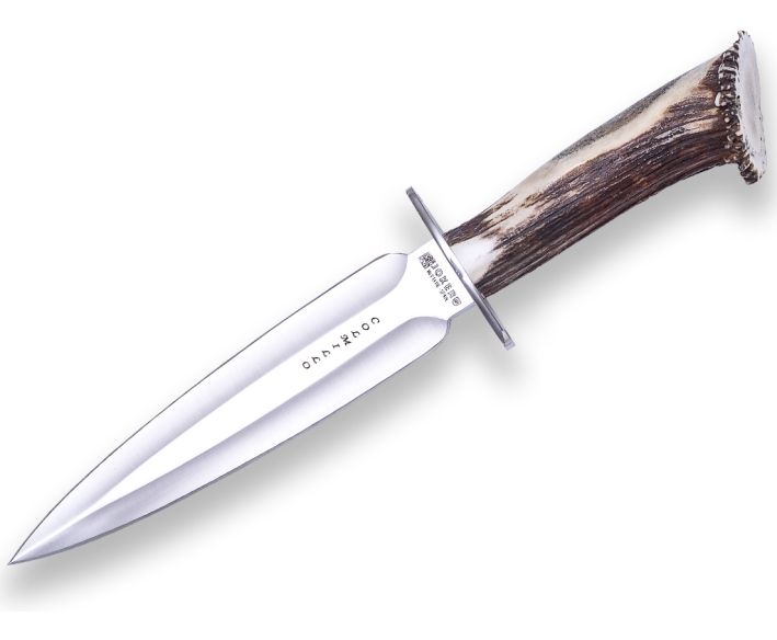 STAG HORN HANDLE, 21,5 CM FIXED BLADE DOUBLE EDGE PIG STICKER JOKER COLMILLO HUNTING KNIFE WITH LEATHER SHEATH.