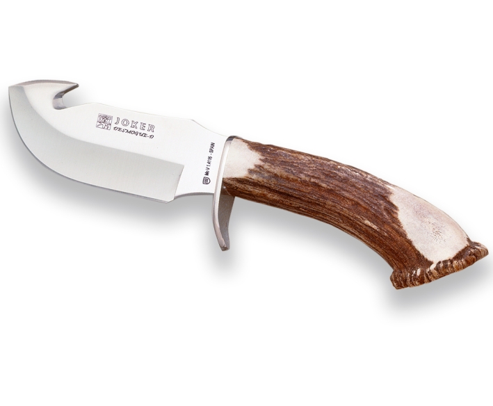 The Joker Desmogue D Hunting Knife has been manufactured under the Denomination of Origin of Albacete (Spain). It is a hunting knife that due to its ergonomics and weight, as well as its cutting and skinning possibilities, make it a very complete tool for any hunter. The Joker Desmogue D sporting knife is made of tang blade made of Mova 1.4116 stainless steel with a blade length of 11 cm, blade width of 4 cm and a thickness of 3.4 mm. The length of the handle is 11.5 cm and it is made of deer antler. The Joker Desmogue D knife is accompanied by a premium leather sheath in brown.