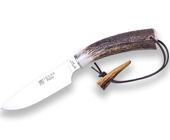 El Cuchillo de Caza Joker Flecha ha sido fabricado bajo la Denominacion de Origen de Albacete (España). Se trata de un cuchillo deportivo ideal para tus lances de caza, así como muy útil para camping,senderismo,supervivencia,bushcraft etc. El Cuchillo deportivo Joker Flecha es de hoja de espiga fabricado en acero inoxidable Mova 1.4116 con un largo de hoja de 12,5 cm, ancho de pala de 3,1 cm y un grosor de 3,5 mm. El largo del mango es de 12,5 cm y está fabricado en asta de ciervo. El cuchillo deportivo Joker Flecha viene acompañado de una funda de piel de primera calidad en color marrón.