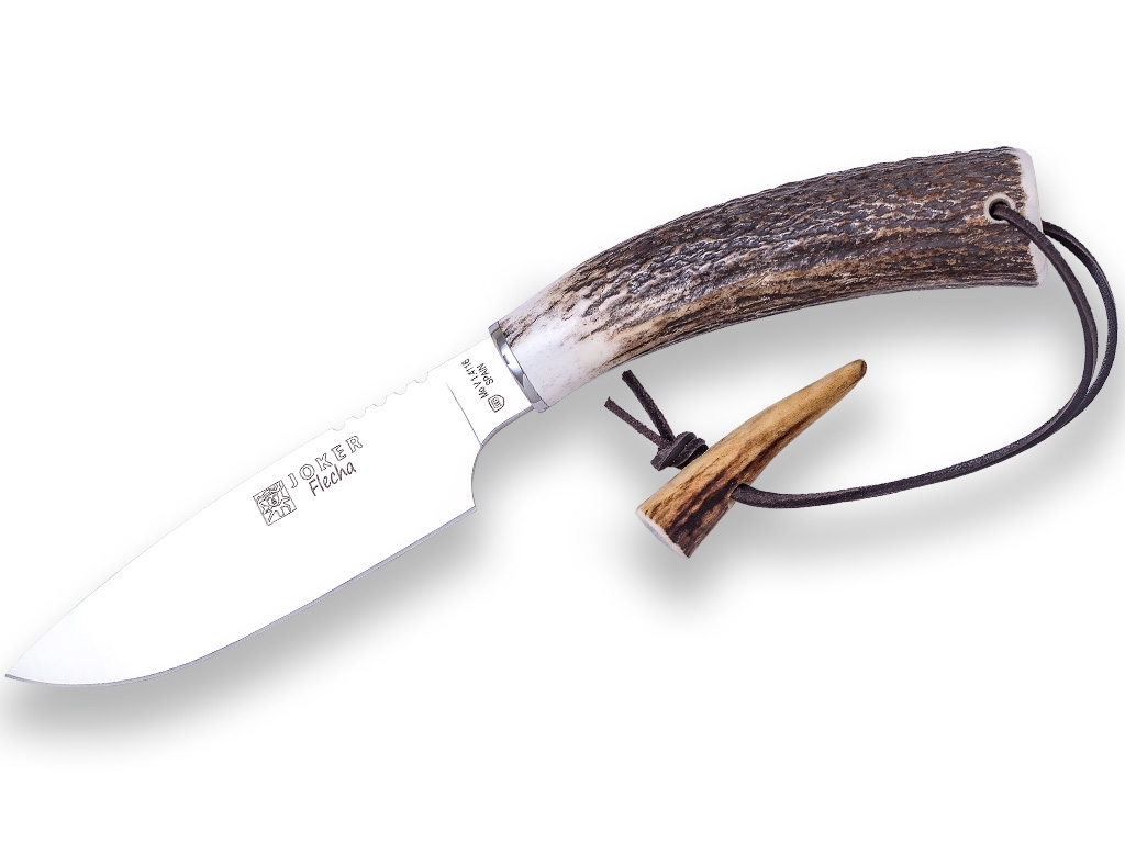 CUCHILLO DE CAZA JOKER FLECHA, PUÑO DE ASTA DE CIERVO, HOJA DE 12,5 CM.FUNDA DE CUERO