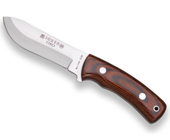El Cuchillo de Caza Joker Oso ha sido fabricado bajo la Denominacion de Origen de Albacete (España). Se trata de un cuchillo deportivo perfecto para tus lances de caza, al igual que es ideal y muy útil para camping, senderismo, bushcraft etc. El Cuchillo deportivo Joker Oso es de hoja enteriza fabricado en acero inoxidable Mova 1.4116 con un largo de hoja de 12 cm, ancho de pala de 3,1 cm y un grosor de 3,7 mm. El largo del mango es de 11,5 cm y está fabricado en madera roja. El cuchillo Joker Oso viene acompañado de una funda de piel de primera calidad en color marrón.