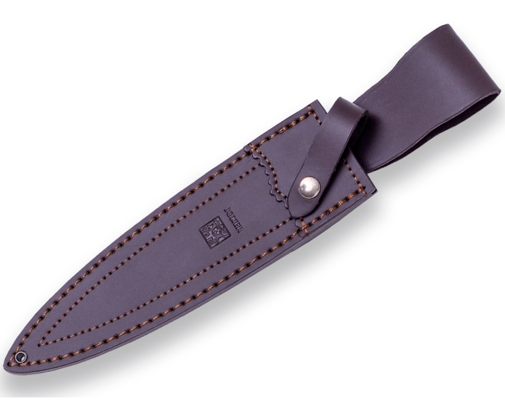 CUCHILLO DE REMATE JOKER COLMILLO, CON PUÑO DE CIERVO Y HOJA DE DOBLE FILO DE 21,5 CM. CON FUNDA DE CUERO