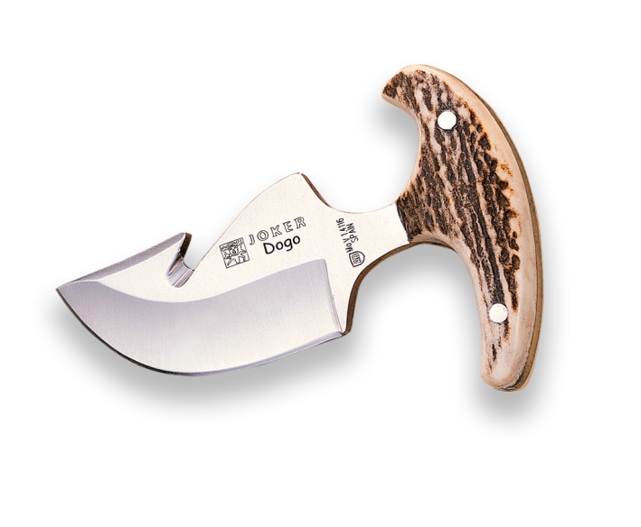 El Cuchillo desollador Joker Dogo ha sido fabricado bajo la Denominacion de Origen de Albacete (España). Se trata de un cuchillo deportivo que por su ergonomia y peso, así como por sus posibilidades de corte y desolle, lo convierten en una herramienta muy útil para el cazador. El Cuchillo deportivo Joker Dogo es de hoja enteriza fabricado en acero inoxidable Mova 1.4116 con un largo de hoja de 8 cm, ancho de pala de 4 cm y un grosor de 4 mm. El largo del mango es de 3 cm y está fabricado en asta de ciervo. El cuchillo Joker Dogoo viene acompañado de una funda de piel de primera calidad en color marrón.