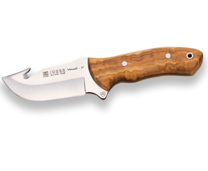 El Cuchillo de Caza Joker Venado ha sido fabricado bajo la Denominacion de Origen de Albacete (España). Se trata de un cuchillo deportivo que por su ergonomia y peso, así como por sus posibilidades de corte y desolle, lo convierten en una herramienta muy completa para cualquier cazador. El Cuchillo deportivo Joker Venado es de hoja enteriza fabricado en acero inoxidable Mova 1.4116 con un largo de hoja de 10 cm, ancho de pala de 3 cm y un grosor de 4 mm. El largo del mango es de 11,5 cm y está fabricado en olivo. El cuchillo Joker Venado viene acompañado de una funda de piel de primera calidad en color marrón.