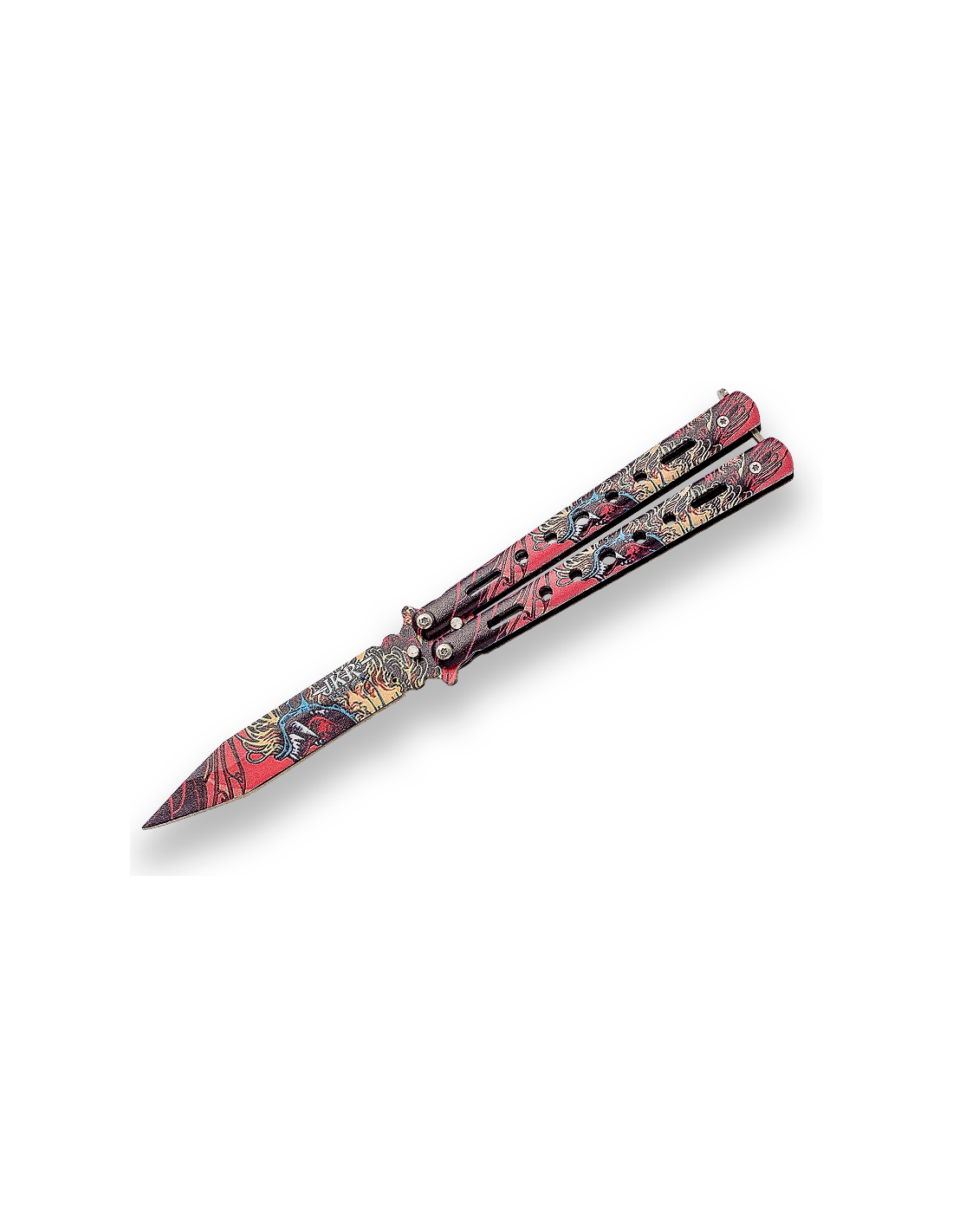 Esta navaja cuenta con una hoja de 10 cm de acero 3Cr13MoV y un mango de aluminio decorado con un diseño de dragón. Su apertura es manual, permitiendo un control total sobre la hoja.
