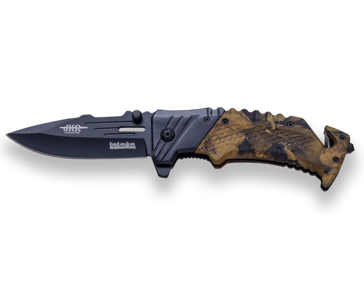 NAVAJA DE RESCATE JKR CON APERTURA ASISTIDA, HOJA 8,5 CM Y PUÑO CAMUFLAJE. ROMPE CRISTALES Y CORTA CINTURONES. CON CLIP PARA CIN