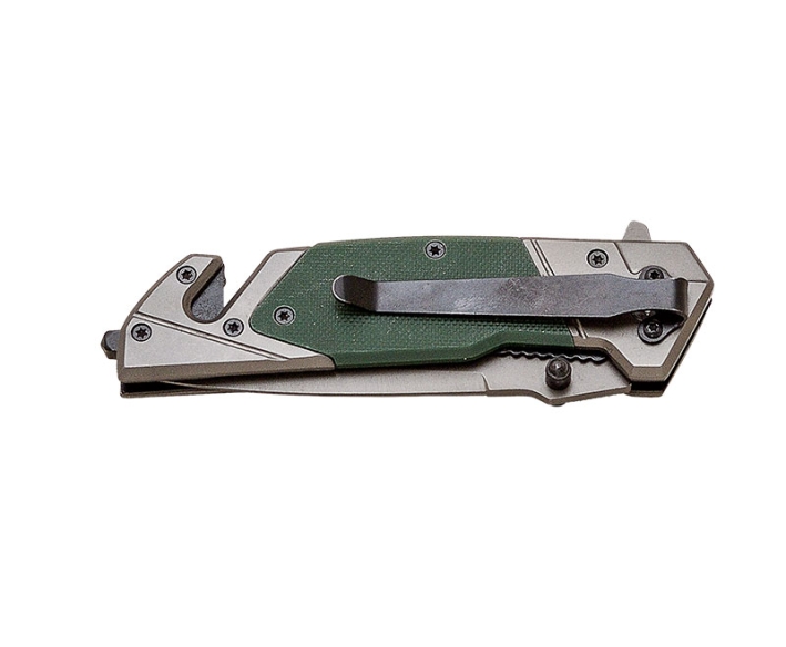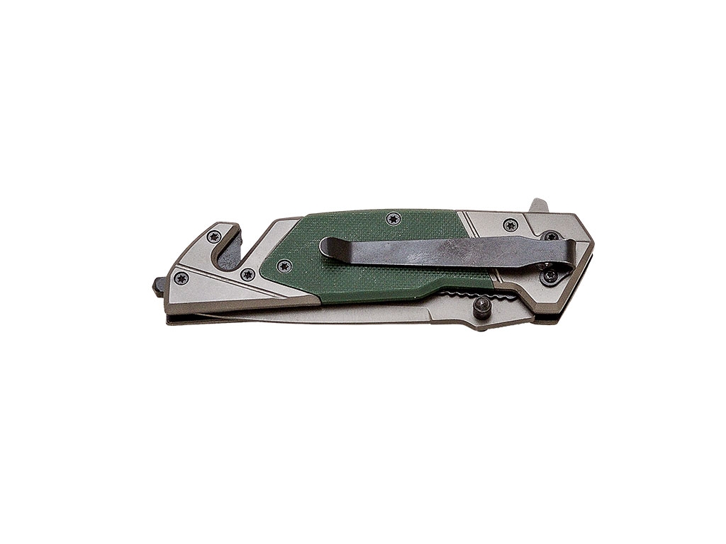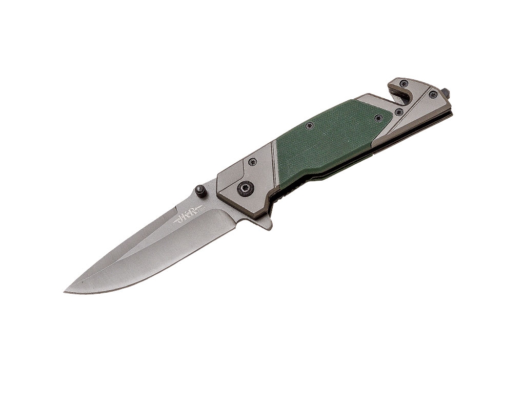 Navaja de rescate JKR PRO 10.021 con mango de G10 con cuchilla corta-cinturones y rompecristales, hoja de acero inoxidable de 9,5 cm con recubrimiento de titanio y virola de acero inoxidable.