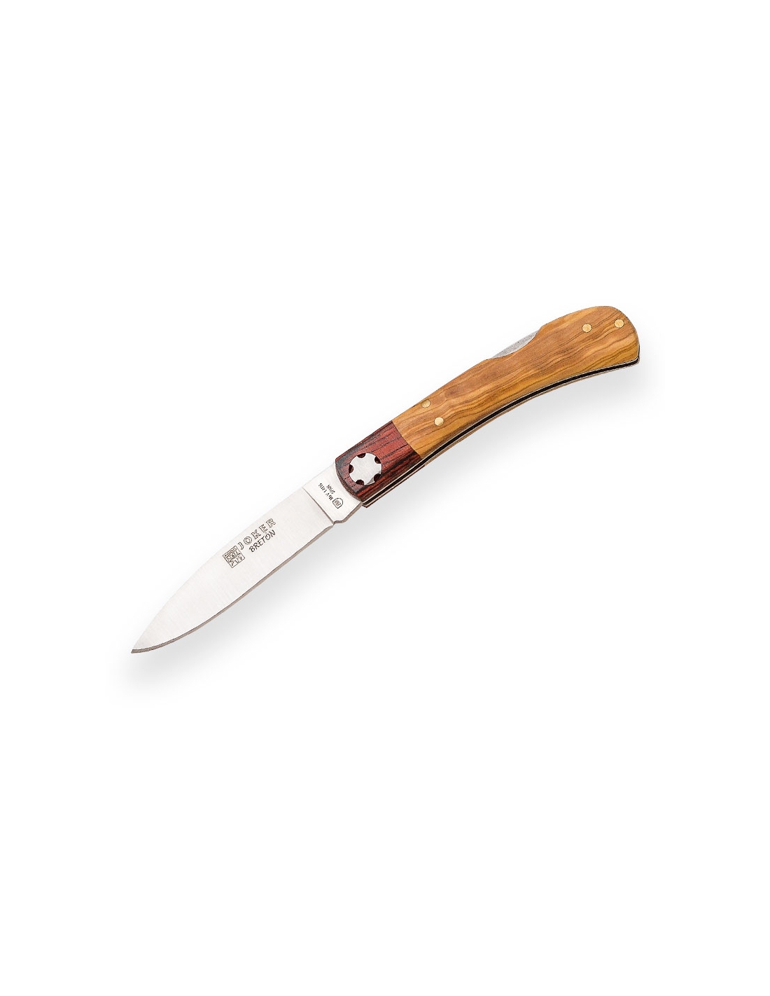 La navaja Joker Bretón es una navaja deportiva fabricada con cachas de olivo combinada con madera roja en la virola. La hoja es de acero inoxidable Mova 1.4116.