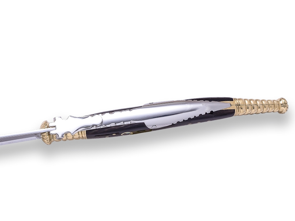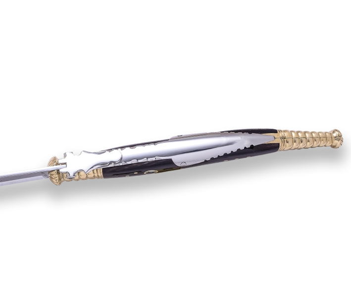 - Manche en corne de buffle incrusté de mosaïque en nacre : prise en main ferme et élégante, renforcée par une virole et un renfoncement en laiton.
