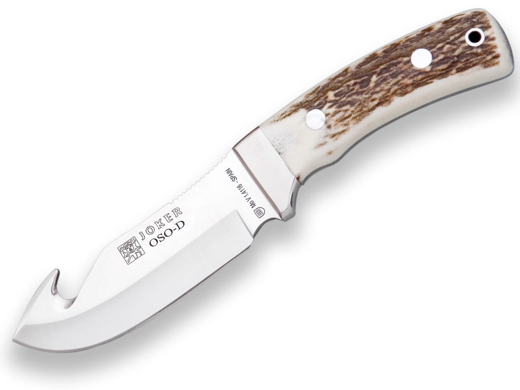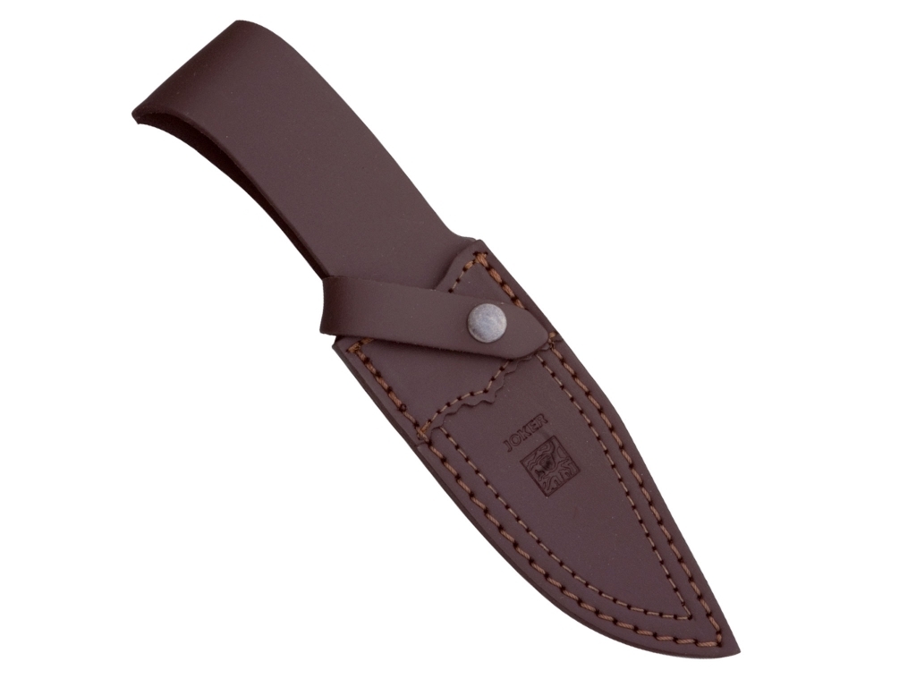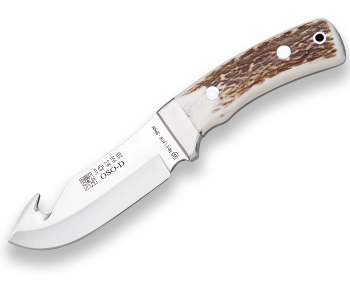 COUTEAU À DÉPOUILLER JOKER OSO, MANCHE CORNE DE CERF, LONGUEUR LAME 12 CM INOX.ÉTUI EN CUIR.
