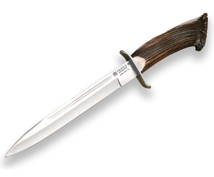 COUTEAU DE CHASSE JOKER CHAMOÍS, LONGUEUR LAME 25,5 CM ACIER INOX, MANCHE CORNE DE CERF. ETUI EN CUIR.