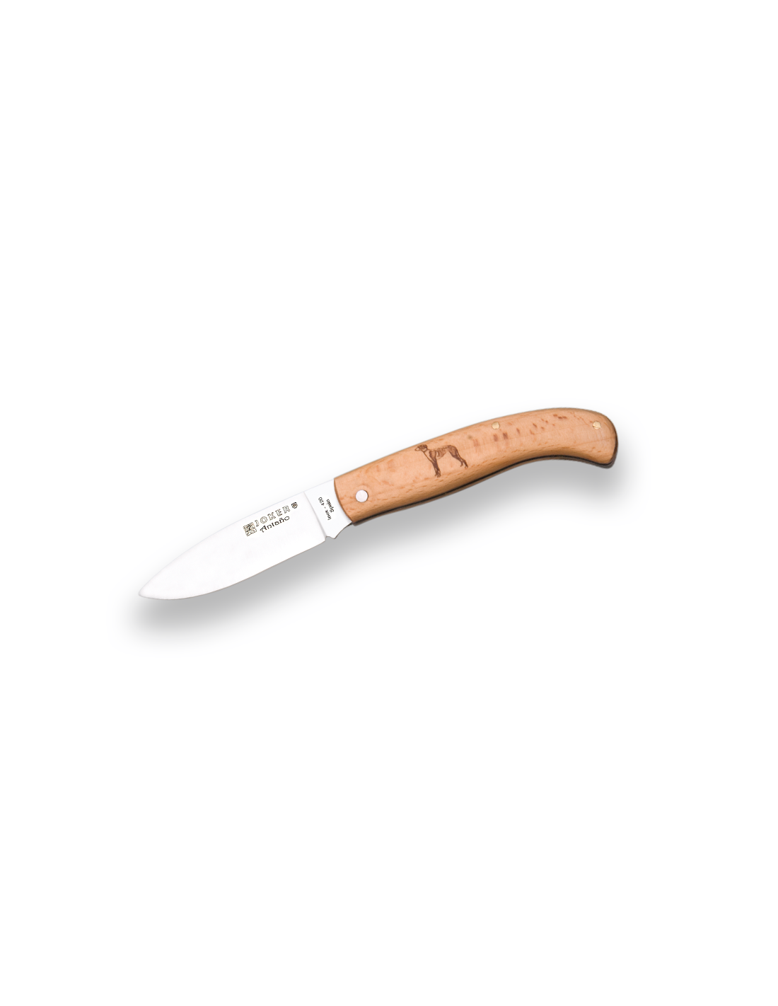 COUTEAU DE POCHE PLIANT MANCHE EN BOIS DE HÊTRE ET LONGUEUR LAME 8 CM. MOTIF LÉVRIER.