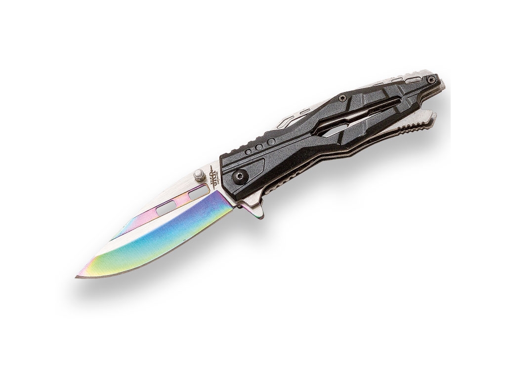 Je commence COUTEAU DE SECOURS MANCHE CAOUTCHOUTÉ LAME 8,5 CM AVEC FOURREAU Referencia: PRO-10023 Ce couteau est doté d'une lame en acier D2 de 8,5 cm et d'un manche en aluminium caoutchouté de 11,5 cm.Il comprend une gaine en nylon et possède un revêtement en titane avec une pointe en forme de goutte.Son système de verrouillage en ligne et son ouverture à roulement à billes le rendent idéal pour les situations d'urgence. View