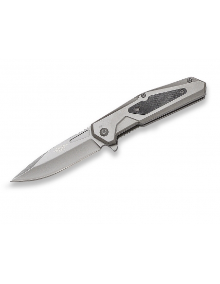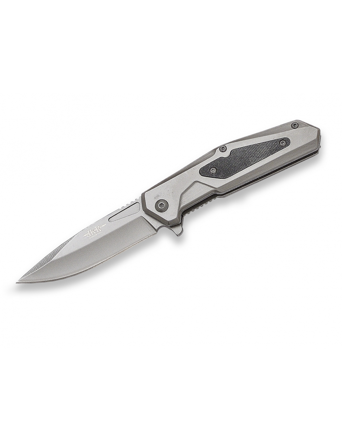 COUTEAU PAPILLON JKR AVEC MANCHE EN ACIER INOXYDABLE DÉCORÉ ET LAME DE 10 CM.